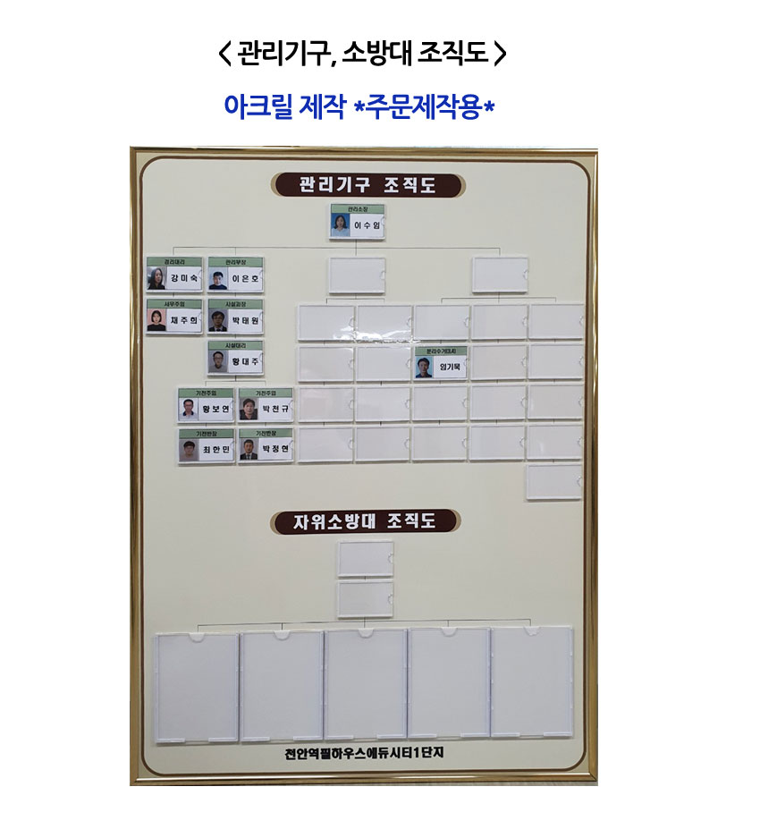 HOME > 아파트 편의용품 > 현황판, 기구표 > 3-4 조직소방기구표(小)