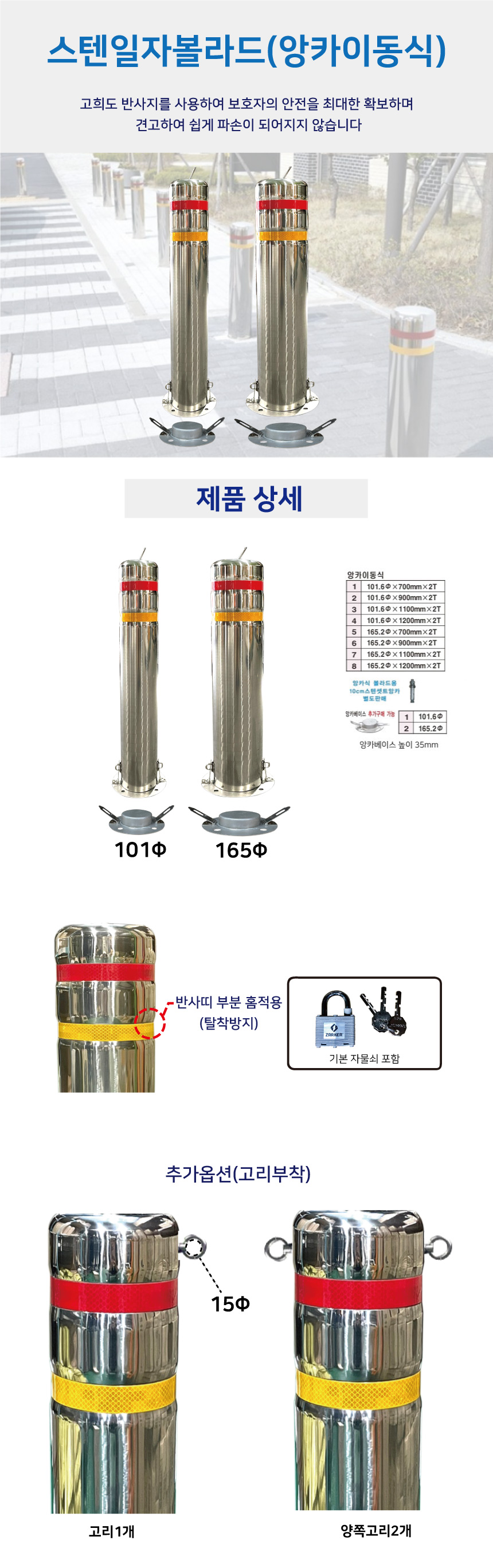 스텐일자볼라드-101Φ (앙카이동식) / 국산